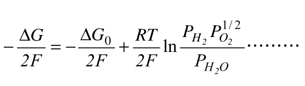 水素と酸素が完全に反応して水になれば、最大1.23Vの電圧を発生する。ここでΔG0は標準自由エネルギーを、Rは気体定数を、PH2、PO2、PH2Oは水素、酸素、水蒸気の分圧を示す。