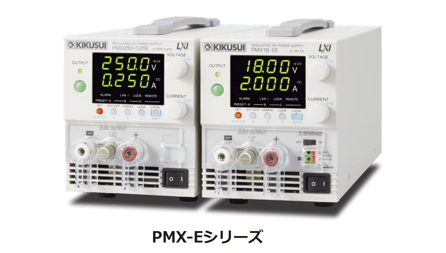 PMX-Eシリーズは、小型、高性能な定電圧(CV)/定電流(CC)直流電源です。シリーズドロッパ方式ならではの低ノイズでありながら、システムアップに不可欠な通信インタフェース群、LAN、USB、RS232C を標準装備しています。