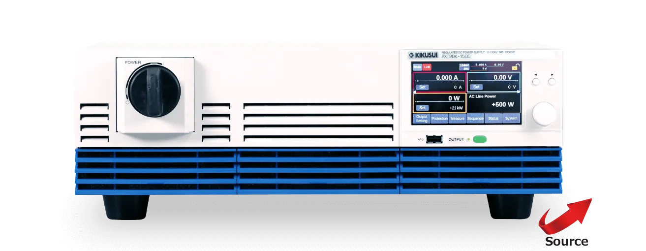 PXTシリーズは、わずか3Uサイズで最大定格出力20kWを実現した高性能・大容量ワイドレンジ直流電源です。内部抵抗可変機能やブリーダON/OFF機能、出力オン/オフ ディレイ機能の搭載に加え、通信インターフェース(LAN、USB、RS232C標準装備)も充実。